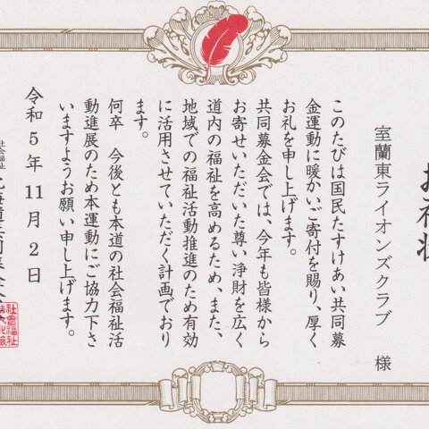 11月2日(木)赤い羽根共同募金運動へ寄付し、お礼状が届きました。