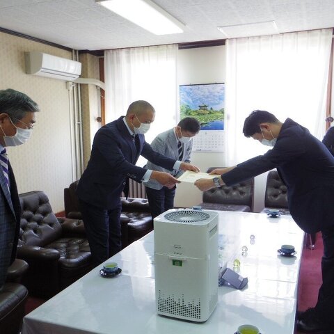 6月28日 室蘭市東町保健センター内適応指導教室へ空気清浄機を贈呈 労...