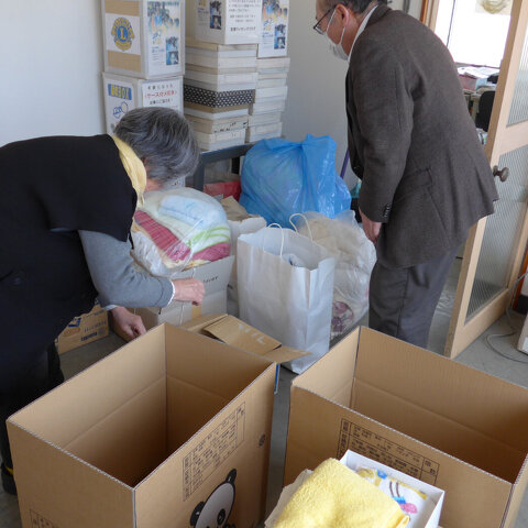 会員に呼びかけて集めていた災害備蓄用の新品、中古タオル等をダンボー...