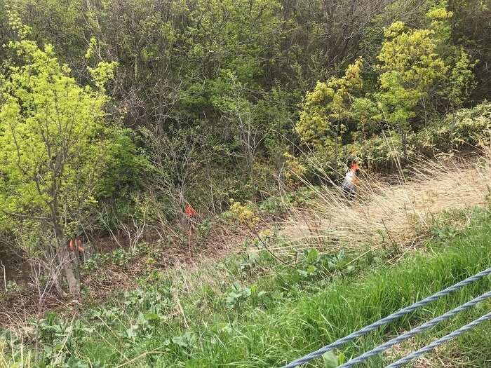 春になり、草などがだいぶ背が高くなる中、3方向に分かれ、傾斜をくだり、