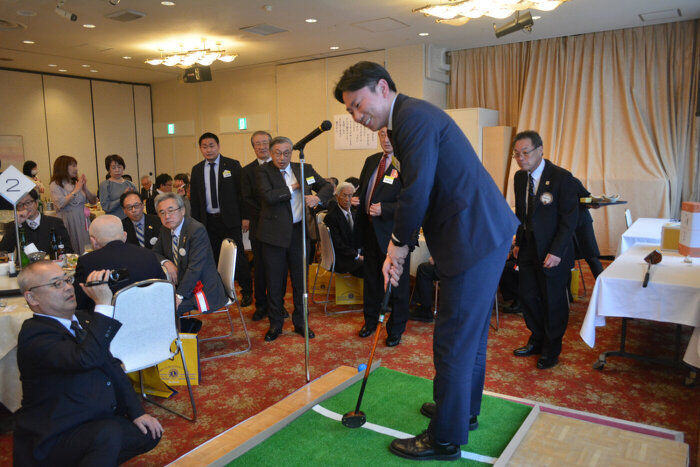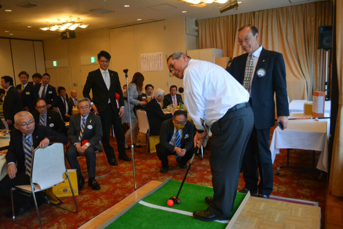 祝賀会では、 限られた時間内に楽しく過ごしていただけるよう記念アクティビティに由来し実行委員長L小林が自ら制作のミニパークゴルフで「ゲーム」を実施。各テーブルより代表者を選出し競い合い楽しい時間を過ごしました。景品として岩内町の名産品を用意、「岩内」をアピール。