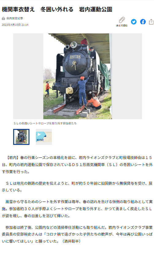 4月 08 4/8実施 岩内運動公園SLテント外し 2023年04月30日(日) アクティビティ 岩内ライオンズクラブ 岩内町技師会さんと共に実施している岩内運動公園SLテント外しを実施。「北海道新聞掲載」
