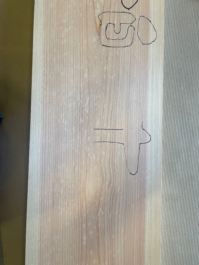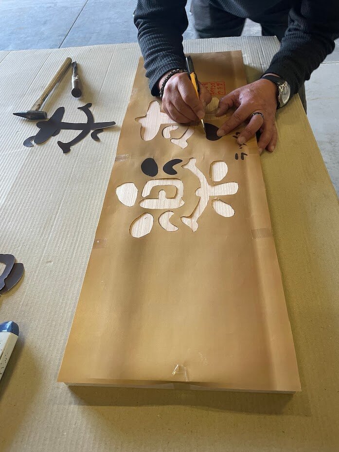 次は、看板用の板が届きましたので「楽来」の文字を彫り始めます。