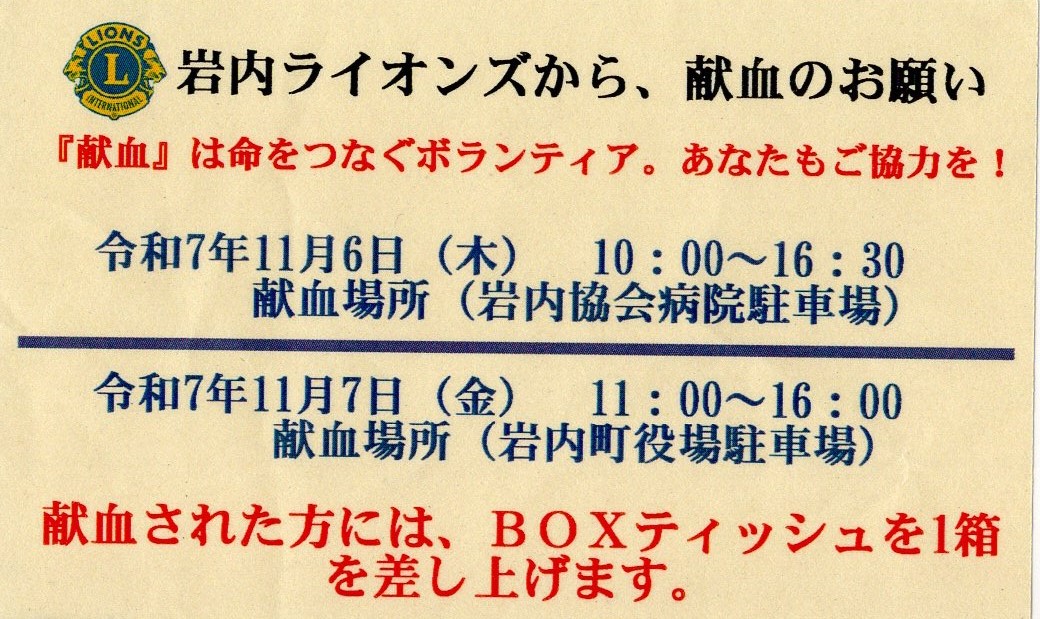 3月 17 献血協力啓発運動 2026年03月31日(火) アクティビティ 岩内ライオンズクラブ NEW 11月から『献血啓発』のために岩内・共和町の商業施設にてポケットティッシュにチラシを入れて 来店する方々に献血協力の呼びかけをしております。 3月も7のつく日はラッキーディ―と火曜市に合わせて、実施いたしました ↑3月23.24日にレイアウトを変更してお配りしました