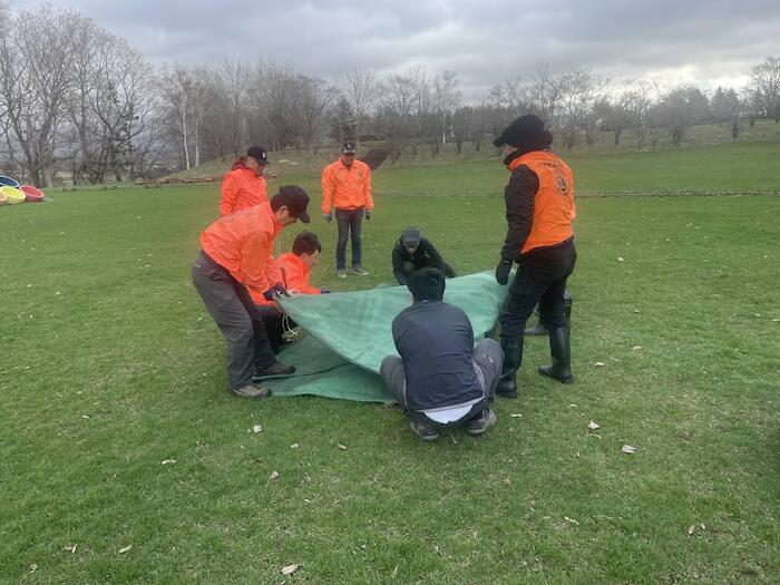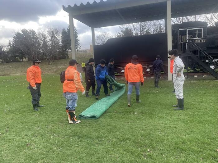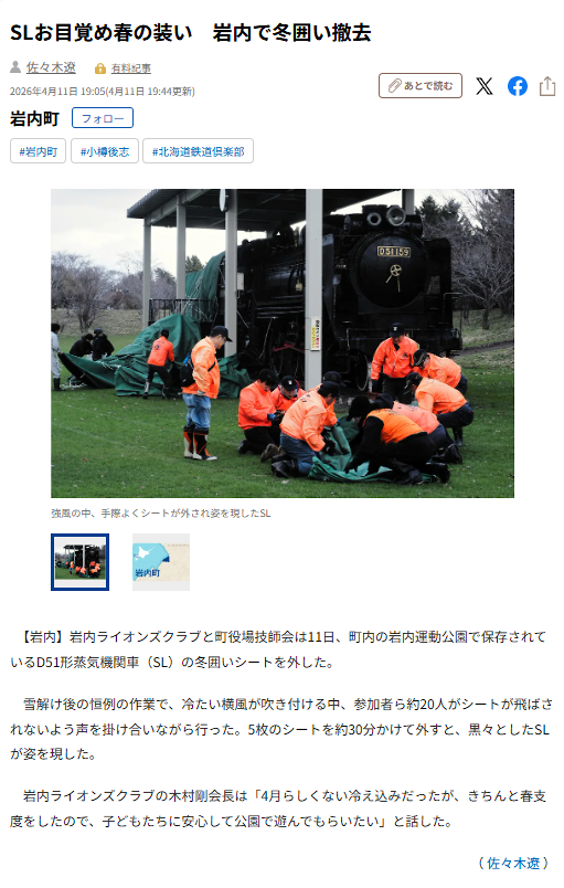 4月 11 SLテント外し時計塔清掃 2026年04月13日(月) アクティビティ 岩内ライオンズクラブ NEW 2026.4.11AM8:00 毎年実施しておりますSLテント外しを岩内町技師会さんと共に実施いたしました 昨夜からの強風の中、安全に気を配りながら実施いたしました