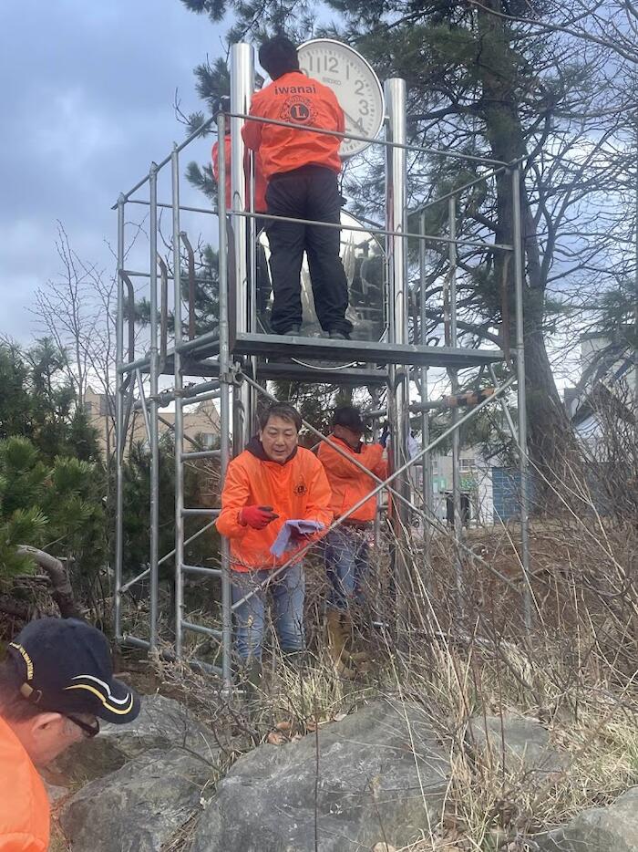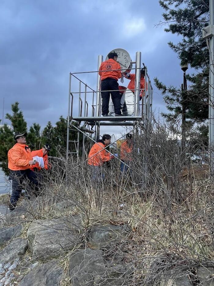 4月 11 時計塔清掃 2026年04月13日(月) アクティビティ 岩内ライオンズクラブ NEW SLテント外しを実施後、岩内町マリンパークへ移動し時計塔清掃を実施いたしました こちらも例年とおり、足場を前日のうちに、菅原Lと弟さんで準備をしていただいております