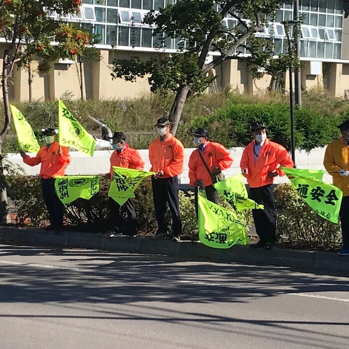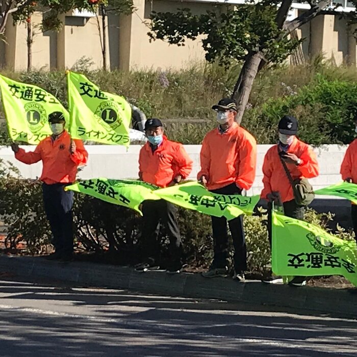 秋の交通安全街頭啓発運動に参加、久々の秋晴れの中、旗がなびいています。