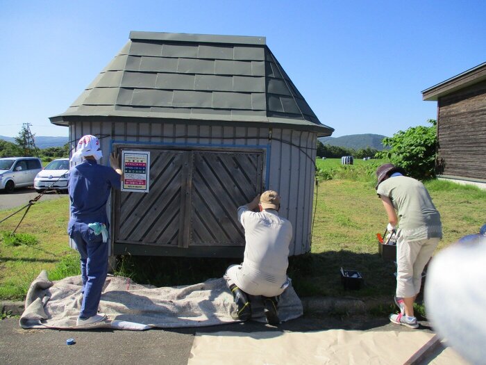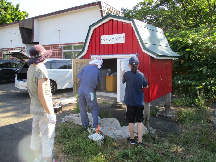 7月17日㈯14時より会員9名と会員の娘さん1名の計10名で、町内のクリーンボックス塗装作業をしました。壊れた箇所の修繕も行いながら全部13のクリーンボックスの塗り直しをしました。