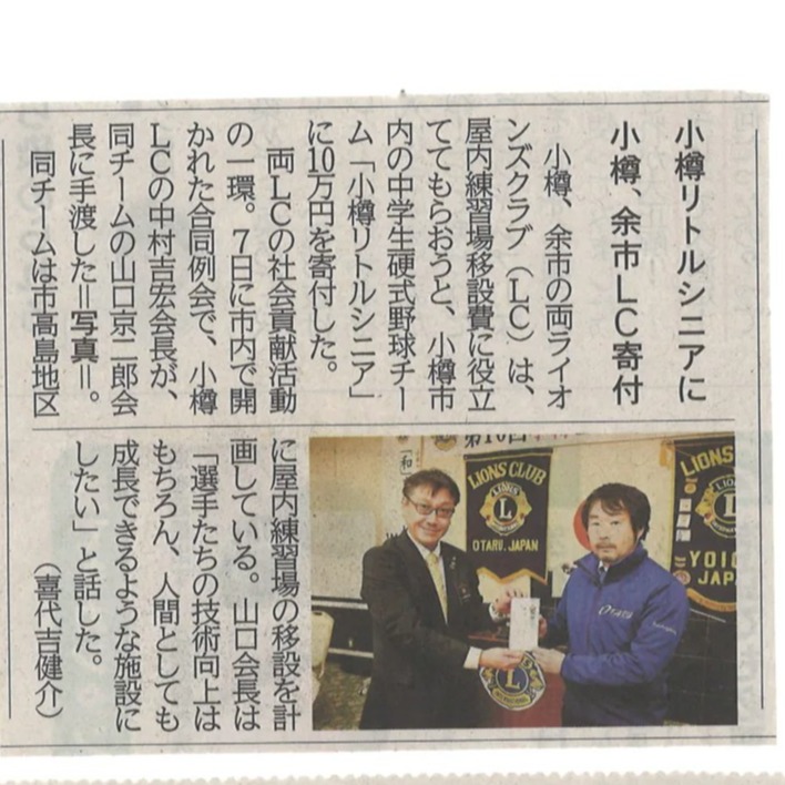 11月 07 小樽LC余市LC合同例会事業 2025年11月21日(金) アクティビティ 小樽ライオンズクラブ NEW 小樽LC余市LC合同例会において合同事業として小樽リトルシニアへ屋外練習場移転費用に役立ててと10万円を寄付しました。 小樽LC分として49,000円拠出