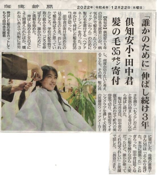 12月 14 ヘアドネーション 2022年12月27日(火) アクティビティ 倶知安ライオンズクラブ ヘアドネーションにご協力いただきました。 町内在住の小学5年生の男の子、北海道新聞に掲載されました。