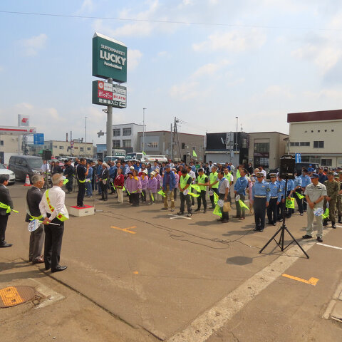 国道5号線両側にて通行ドライバーに交通安全旗にて交通安全を呼びかけま...