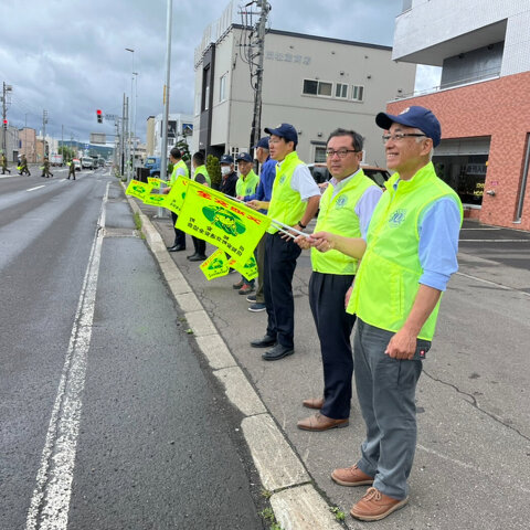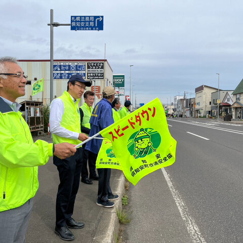 俱知安商工会議所前、国道5号線両側にて通行ドライバーに交通安全旗によ...
