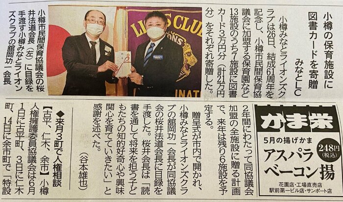 CN61周年記念アクティビティとして、小樽市民間保育協議会に加盟している13施設に図書カード¥30000を寄贈した。