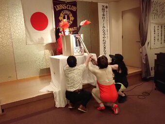 7月 15 第1446回例会 2021年07月15日(木) ミーティング 小樽みなとライオンズクラブ 新会長スタートを盛り上げるべく、当クラブのお家芸でもある仮装寸劇を披露。今年はオリンピックにあやかり、三役はそれぞれの選手に扮し聖火台に灯をともし、今年度をスタートしました。