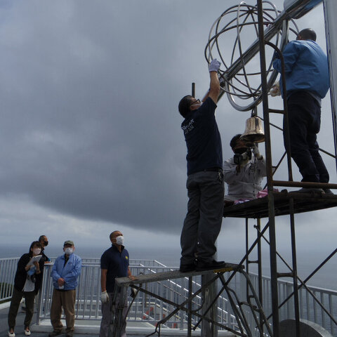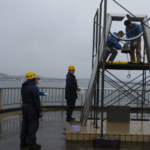 地球岬展望台「幸せの鐘」設置場所に於いて、足場を組み立てて研磨機や...