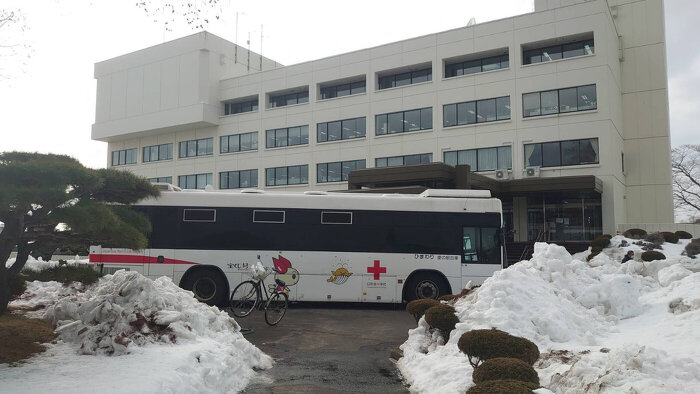 市庁舎前に停められた献血車両