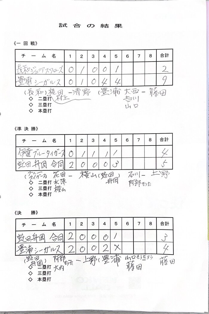 4対3にて、豊浦シーガルスが1点差を守り抜きました。