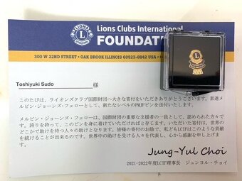 9月 10 LCIF寄付 2021年09月29日(水) アクティビティ 伊達ライオンズクラブ ECHO Vol.3 MJFとして送金しました。 7月16日 $1,000(110,634円)3回 須藤 敏幸 7月20日 $1,000(110,634円)1回 山木 博孝 9月10日 $1,000(109,926円)40回 壽淺 雅俊 累進メルビン・ジョーンズ・フェローとして 須藤 敏幸Lへ新たなレベルのPMJFダイヤモンドピンが届きました。 メルビン・ジョーンズ・フェローとして 山木 博孝LへMJF盾が届きました。