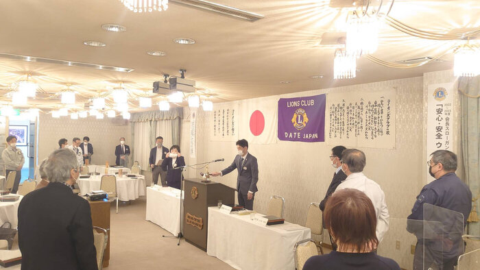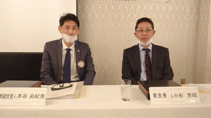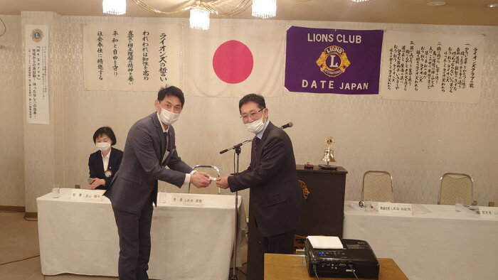 ライオンズクラブ国際協会より小杉芳昭前会長へ新会員を2名紹介したとしてメンバーシップキーが授与されました。