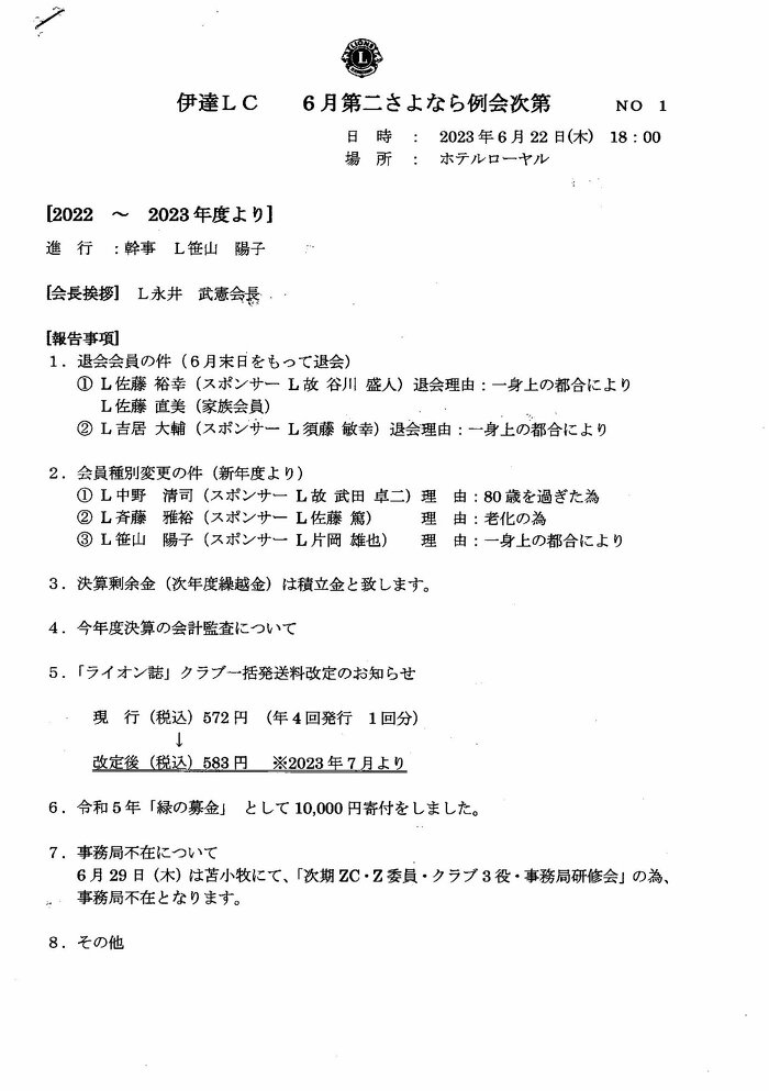 さよなら例会が2023年6月22日(木)1800時よりホテルローヤルにて開催されました。永井会長も元気に参加されて今年度の全日程を締めくくってくれました。