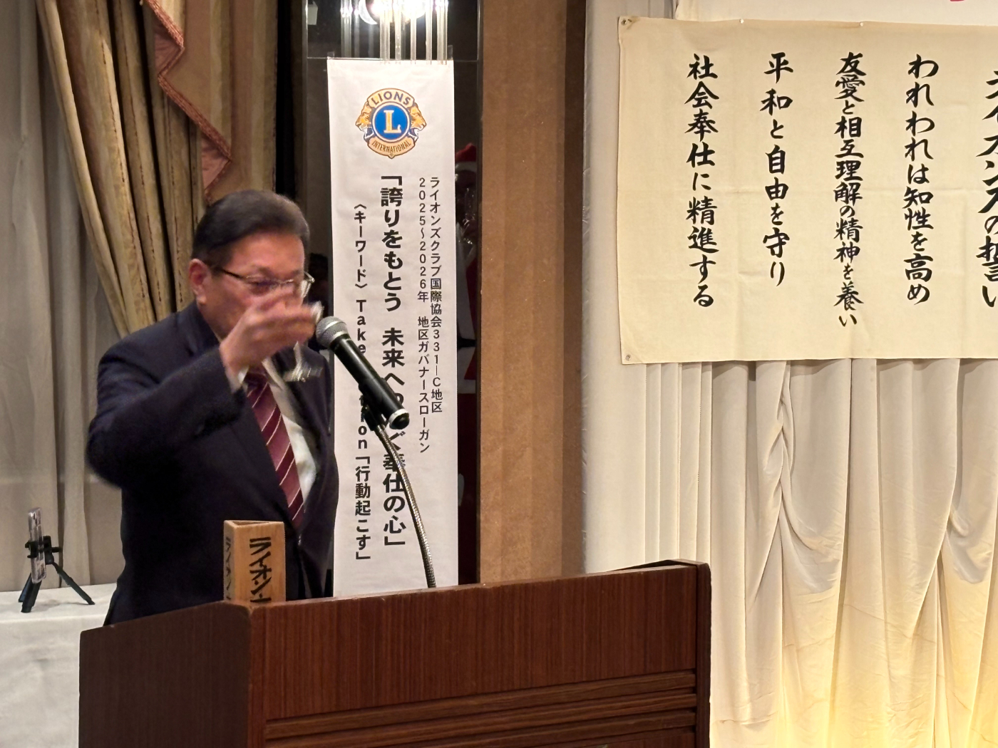 ライオンズの誓い、片岡Lより 「日頃から、ライオンズ活動について、ご家族のみなさんのご理解、ご協力に感謝申し上げます。」と御礼の言葉から、誓いの宣言へ