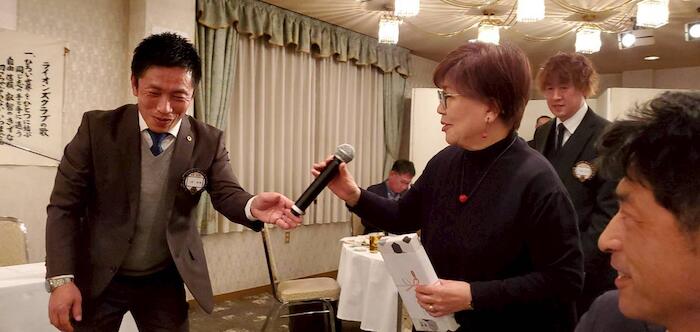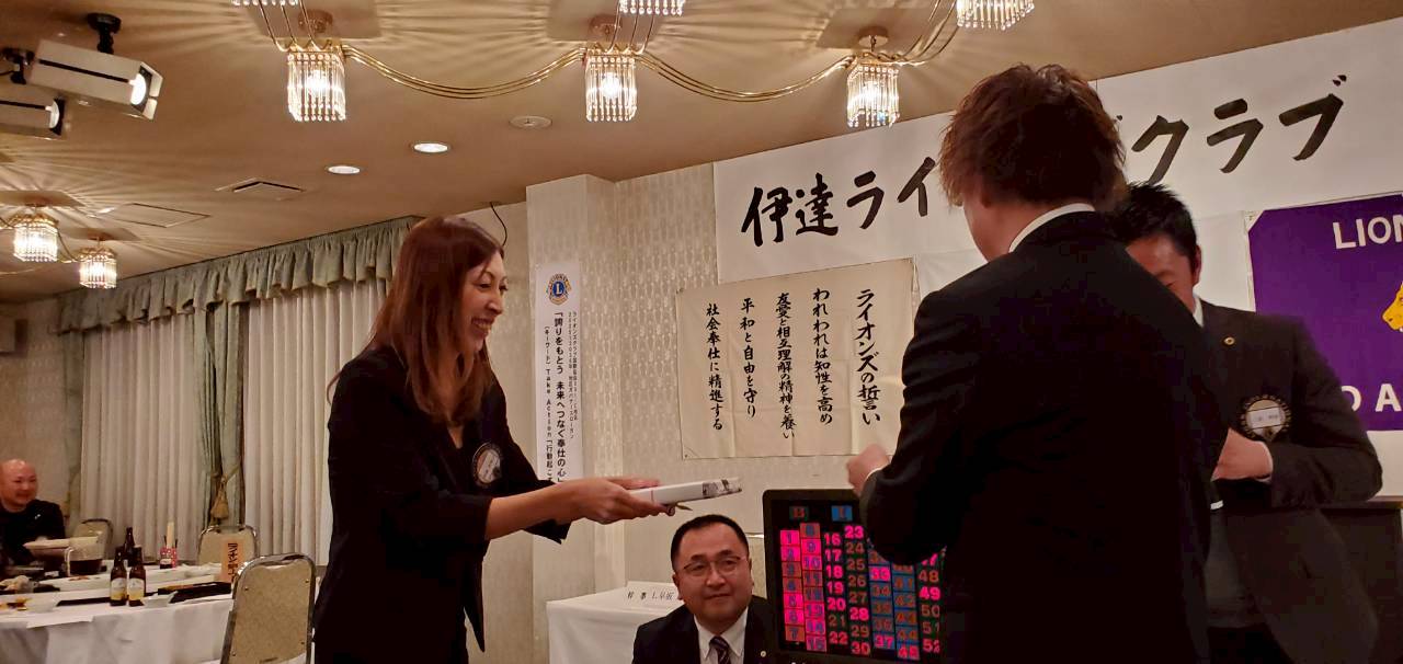 ビンゴゲーム 第1位は、岩崎Lになりました。記念品の贈呈です。札幌から例会へ駆けつけてもらって、1位で良かったです(笑)