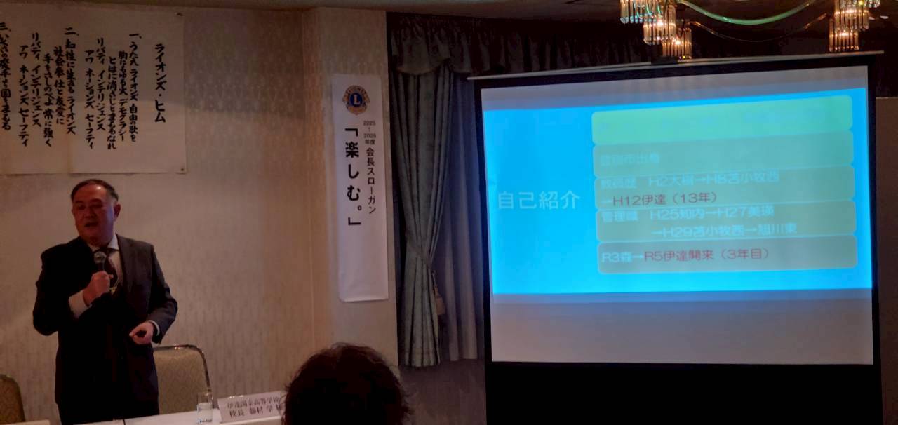 3月 26 3月第二例会 2026年03月30日(月) ミーティング 伊達ライオンズクラブ NEW 伊達ライオンズクラブ、3月第二例会の開催。 教育・YCE委員会担当例会。 例会セレモニー、ライオンズの誓い、後藤Lより 木村会長から、会長挨拶。 担当委員会、教育YCE委員会、中村委員長より、例会主旨説明と講師の紹介 ゲスト講師には、伊達開来高等学校、藤村校長よりご講演を頂きました。テーマは「教育について」 教育内容にまちの企業との連携を高めて、情報共有されている取組みはとても斬新な印象を受けました。 指名委員会報告、壽浅より2026~2027年度、役員候補者の報告を頂きました。 例会出席率の発表、桂委員長より 閉会ゴング、皆さまお疲れ様でした。