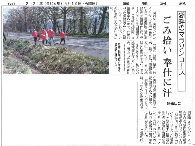 5月 08 地区内一斉清掃事業 2022年05月12日(木) アクティビティ 洞爺ライオンズクラブ ECHO Vol.11 5月8日「地区内一斉清掃」事業として、洞爺湖畔の約5kmのごみ拾いをおこないました。 労力ACT:17時間