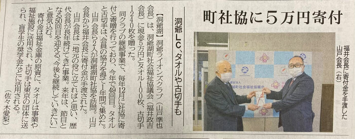 12月 09 洞爺湖町社会福祉協議会へ寄付 2022年12月14日(水) アクティビティ 洞爺ライオンズクラブ 洞爺湖町社会福祉協議会へ行っている福祉金庫事業への寄付5万円は今年で49回目となりました。この他にも会員から募ったタオルと古切手の贈呈も合わせて行いました。 タオルは112枚、古切手は1240枚となりました。 金銭アクト50,000円 労力アクト 1H