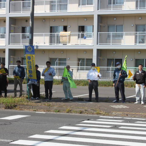 12:00より、めもりある雲上閣斜め向かい側にて室蘭市交通安全人と旗の波...