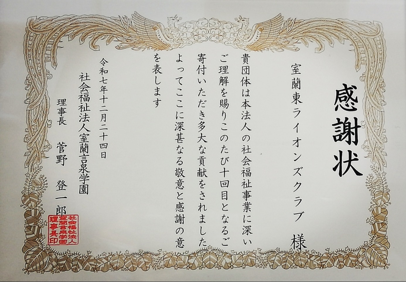 12月 24 社会福祉法人言泉学園に寄付 2025年12月24日(水) アクティビティ 室蘭東ライオンズクラブ NEW 12月24日(水)三役が社会福祉法人言泉学園へ訪問し、 12月第2例会時に開催したクリスマスチャリティーオークションの益金を寄付。 ■労力ACT:3時間 ■金銭ACT:50,000円