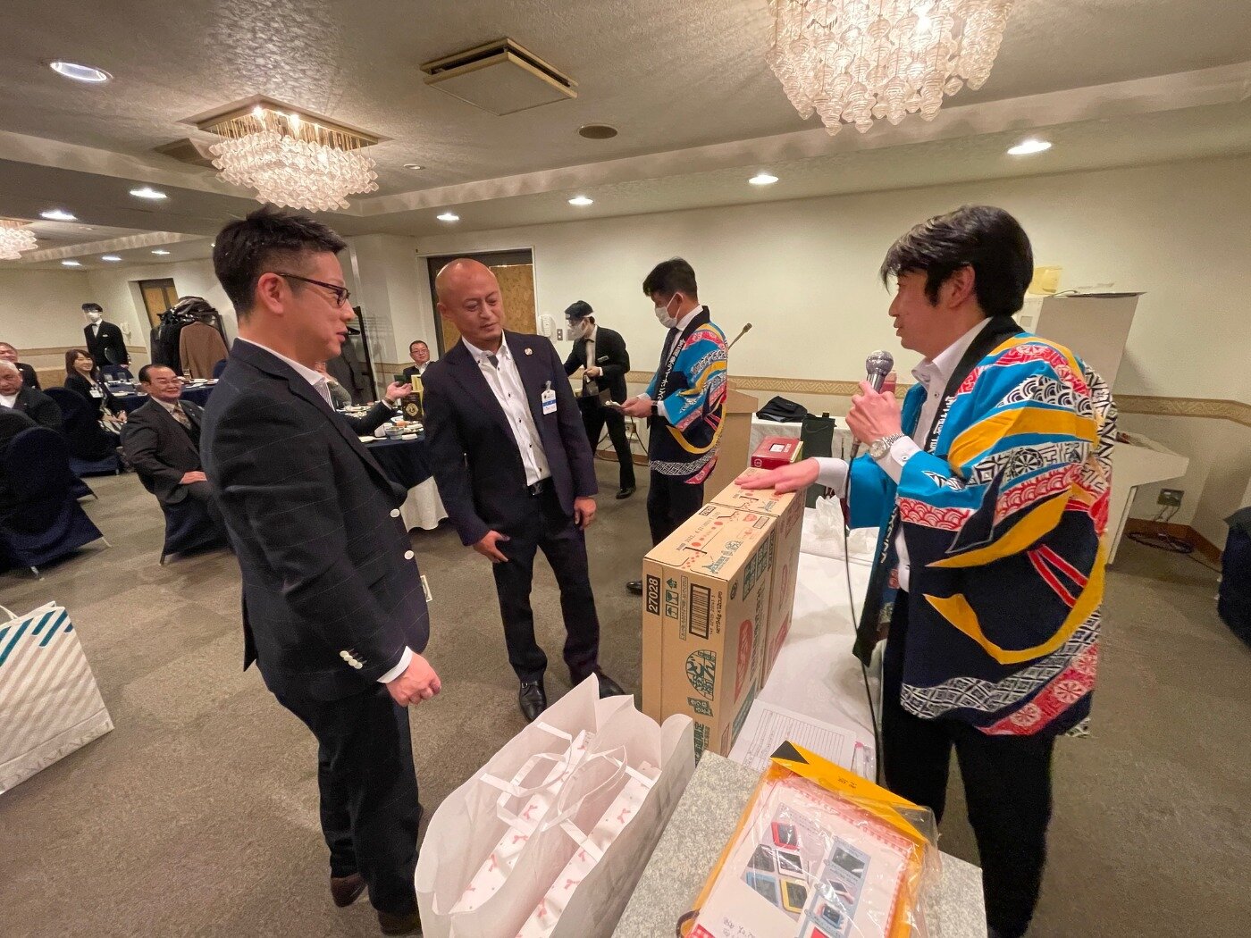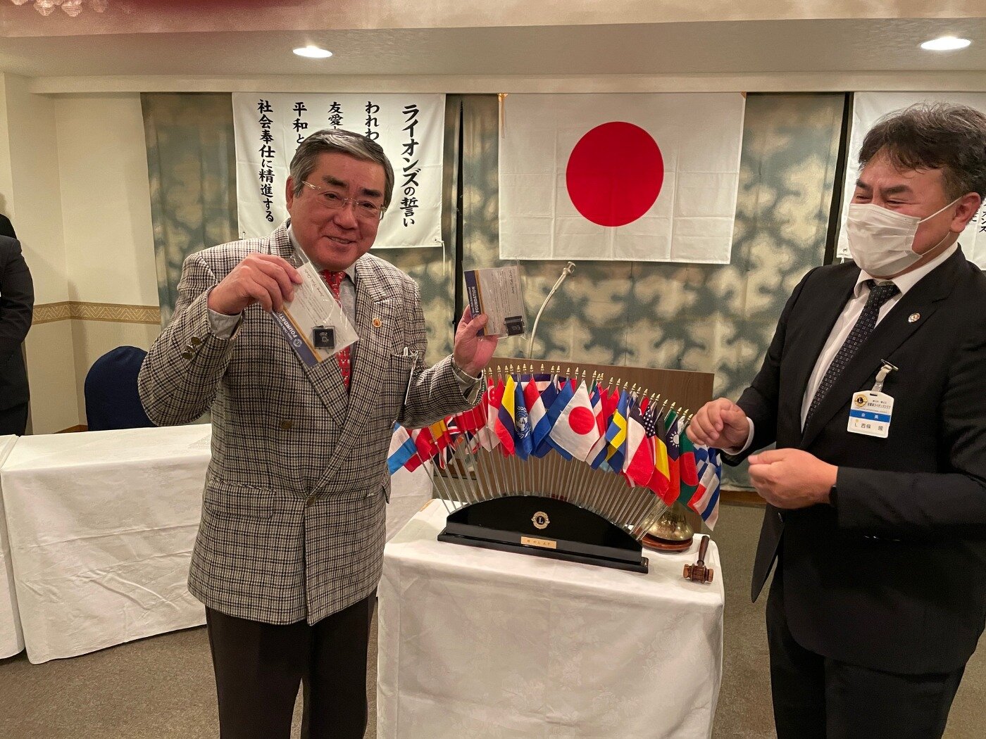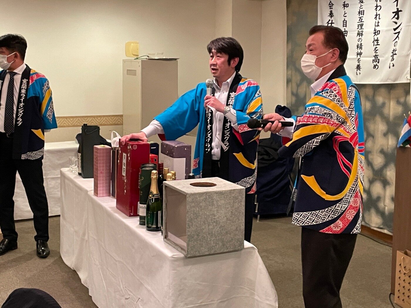 12月 15 第1422回 12月第2クリスマス例会 2021年12月24日(金) ミーティング 室蘭東ライオンズクラブ ECHO Vol.6 PMJFピン贈呈式 L本所 光男 PMJF1000$献金 40回目41回目実施 寄付金額227,408円(2回分) 年末恒例のオークションで会場は大盛り☆ 早く支払いにいかないと、落札金額より高くなりますと脅すL門脇 名司会 令和3年12月15日(水)18:00より蓬崍殿にて、今年を締めくくる12月第2クリスマス例会が開催され、1人2点以上お買い上げ鉄則のオークションではチャリティーオークションでは会員が持ち寄ったお酒や卵、お菓子等が次々と落札されていき、沢山の益金が集まりました。