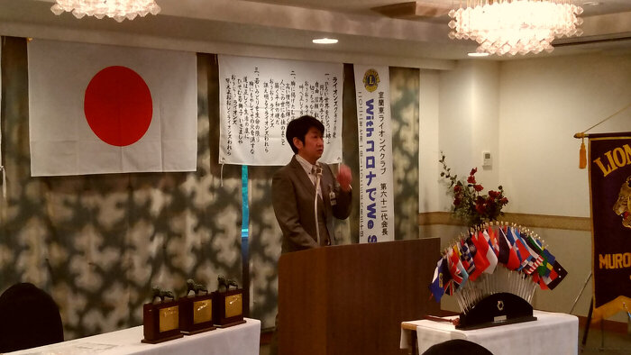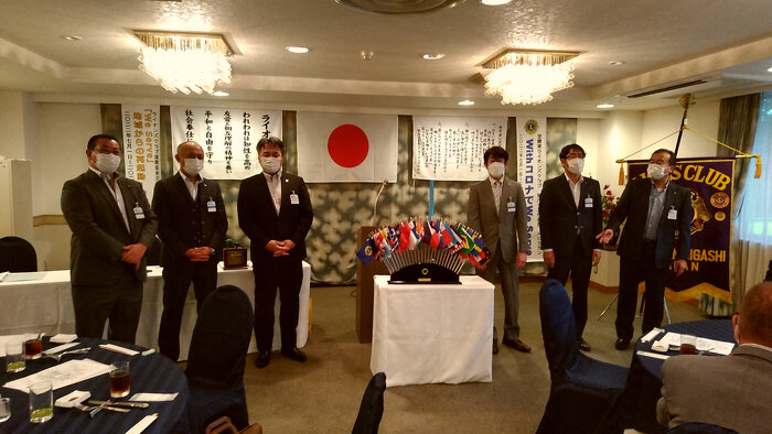 令和4年7月6日(水)18:00より蓬崍殿にて7月第1例会が開催されました。新旧役員バッチ交換式にて前三役 西條会長、紙谷幹事、早坂(憲)会計からの意思を受け継ぎ、今期の三役 門脇会長、山田幹事、髙橋(伸)会計が所信表明を行いました。その後に2021年7月~2022年6月までの皆出席者L門脇・L西條・L及川・L児島・L紙谷・L本所・L山田・L新岡(元)・L髙橋(伸)・L早坂(憲)・L大久保 計11名に皆勤バッジを贈呈、会場内は大きな拍手に包まれました。懇親会時では委員長や役員のメンバー一人ひとりが一年の抱負を発表し、気持ちを新たにしました。