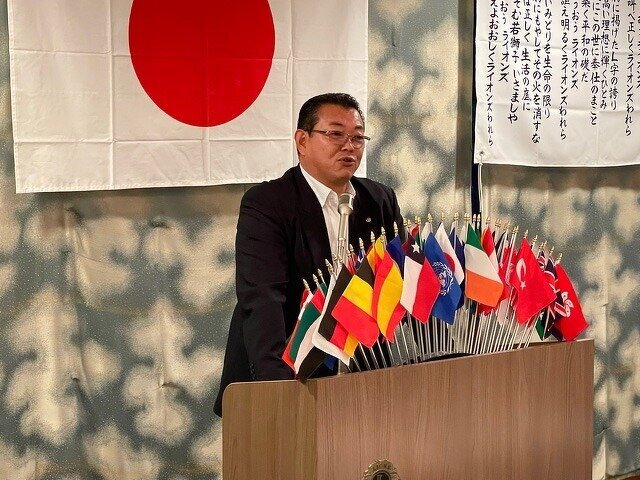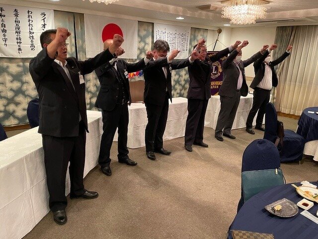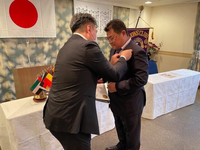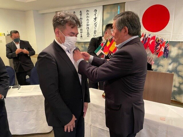 L本所前会長お疲れさまでした。バッチ交換(緊張の新会長 L西條)