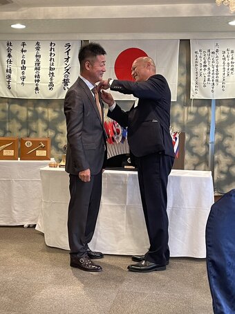 新旧役員バッチ交換式にて前三役 紙谷会長、新岡(元)幹事、早坂(憲)会計からの意思を受け継ぎ、今期の三役 新岡(尚)会長、大久保幹事、大坂会計が所信表明を行いました。その後に委嘱状授与式と2023年7月~2024年6月までの皆出席者(12名)に皆勤バッジ贈呈式が行われ、会場内は大きな拍手に包まれました。懇親会時ではメンバー一人ひとりが一年の抱負を発表し、気持ちを新たにしました。