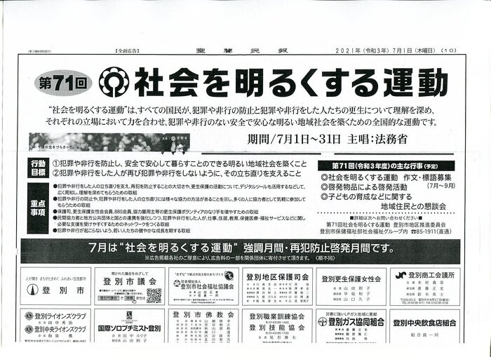 7月 01 社会を明るくする運動 広告掲載 2021年07月29日(木) アクティビティ 登別中央ライオンズクラブ ECHO Vol.1 広告料の一部は青少年の健全・地域での啓発・相談・研究活動・関係団体に寄付 金銭/5,500円