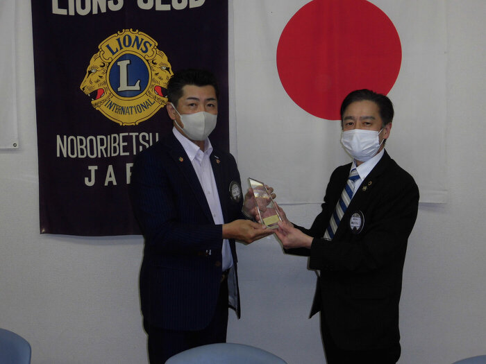 6月第二例会にて、次期会長より会長に1年間の労をねぎらい、クリスタルトロフィを贈呈