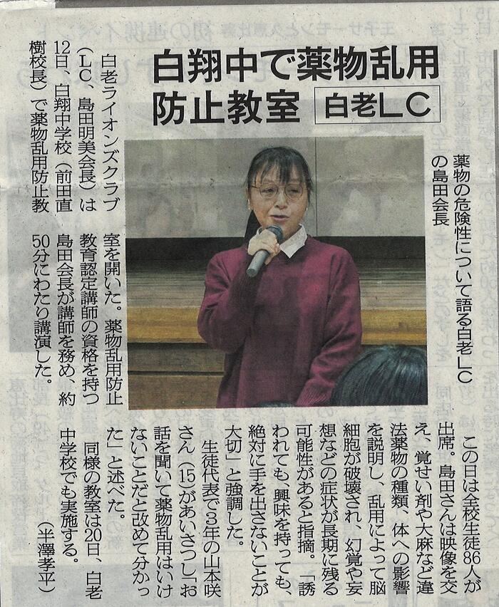 11月 20 薬物乱用防止教室開催 2025年11月21日(金) アクティビティ 白老ライオンズクラブ NEW 11月12日、11月20日 白老町内中学校2校で薬物乱用防止教室を開催しました。講師はL島田、L広地が務めました。