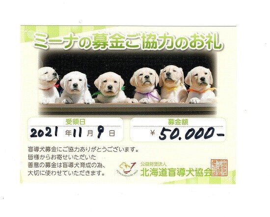 11月 09 CN17周年記念ACT・ミーナ募金 2021年11月18日(木) アクティビティ 函館臥牛ライオンズクラブ ECHO Vol.5 CN17周年記念ACTとして北海道盲導犬協会・ミーナ募金へ50,000円寄贈 北海道盲導犬協会Youtubeチャンネルご案内