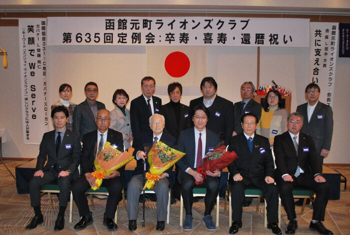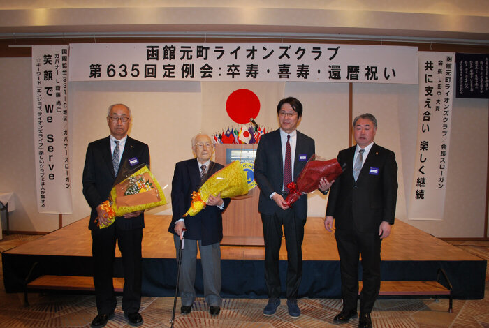 2月 18 卒寿・喜寿・還暦祝い例会 2025年02月20日(木) ミーティング 函館元町ライオンズクラブ 2月第2例会「卒寿・喜寿・還暦祝い例会」を開催しました。 3名の方に花束と記念品を贈り、会員一同で祝杯をあげました。