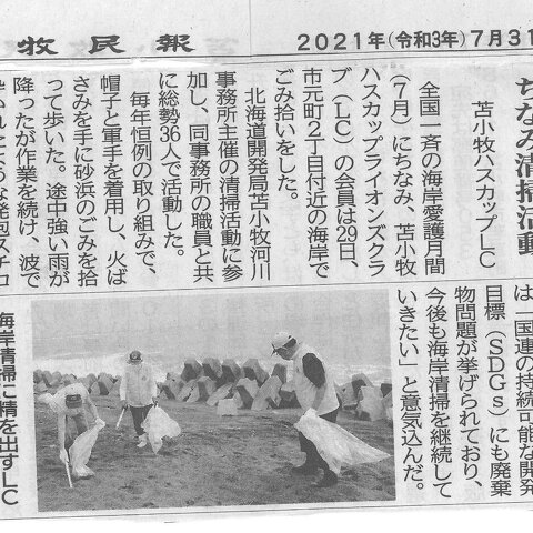 2021年7月29日胆振海岸のゴミ拾いを実施した新聞が苫小牧民報に掲載さ...