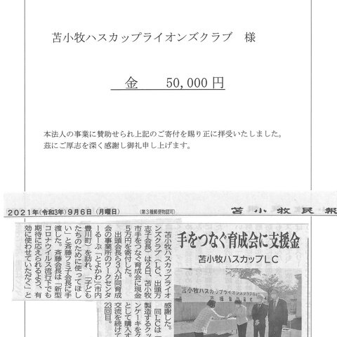 2021年9月2日に手をつなぐ育成会へ本年度支援金を贈呈した。 金額 50...