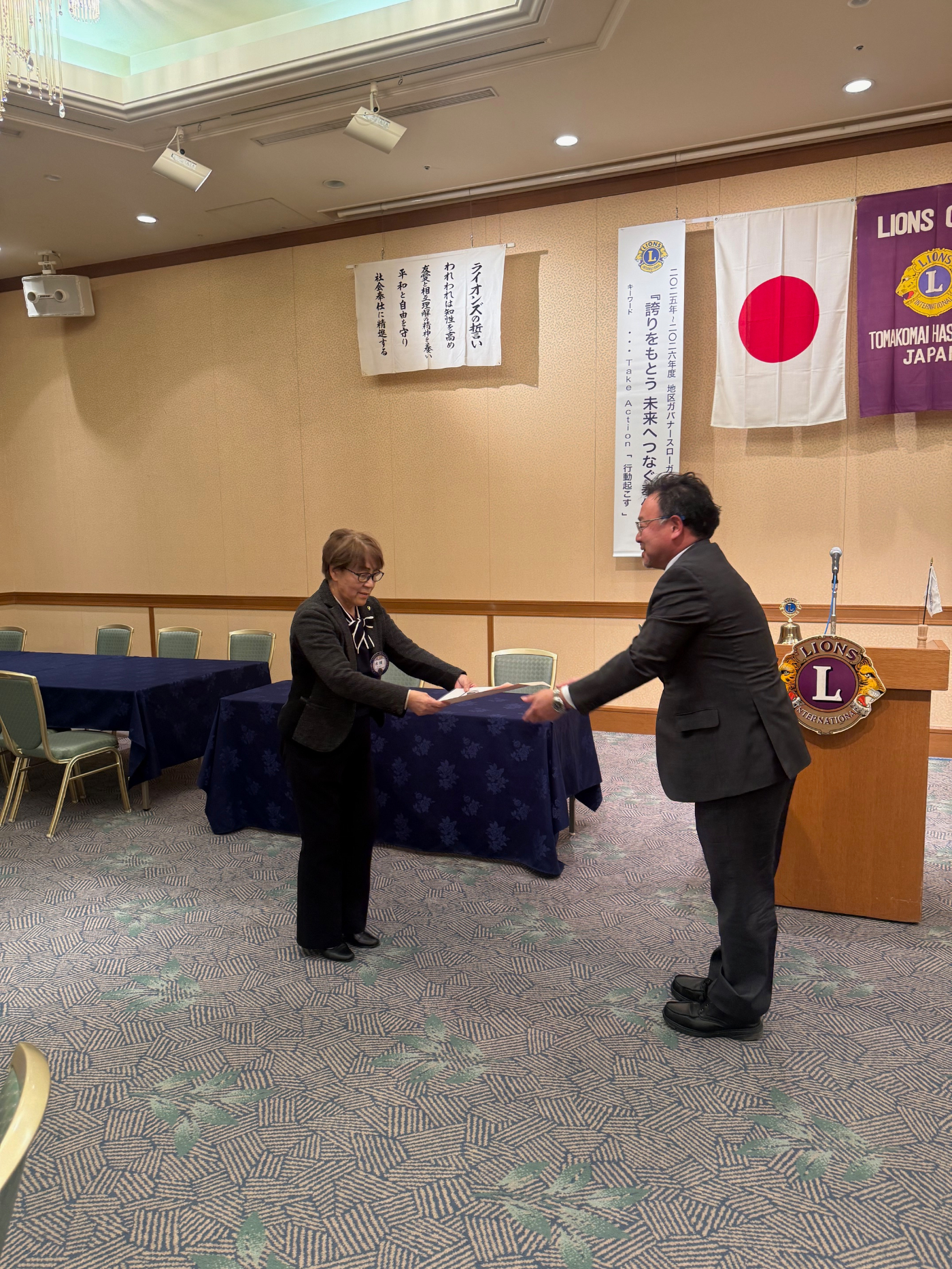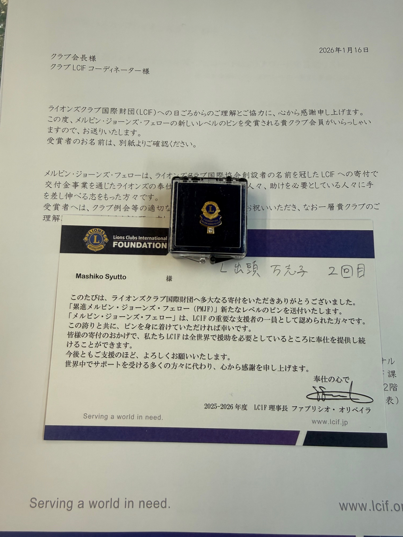 2月 25 Ⅼ出頭 万志子MJF1000$献金(分割)アワード贈呈 2026年02月25日(水) アクティビティ 苫小牧ハスカップライオンズクラブ NEW Ⅼ出頭 万志子 MJF1000$献金 2回目 アワード贈呈 2月第1例会において、Ⅼ出頭 万志子が2回目のMJF1000$献金 ピンを贈呈した。 2017年より災害の献金や100$献金の積み重ねで達成することができた。