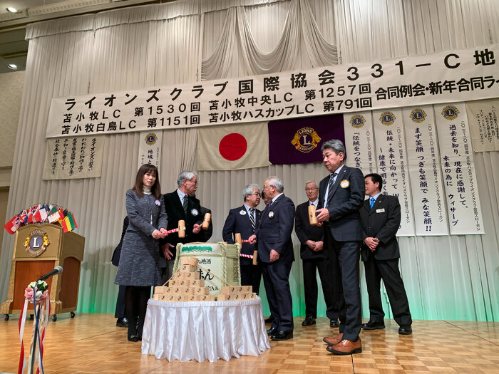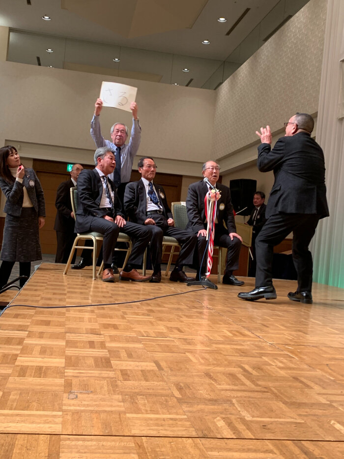 年男・年女の新年樽酒の鏡割り、ウィサーブはガバナーL渡部 義男を筆頭に元ガバナー達のご発声で懇親会がスタートしました。