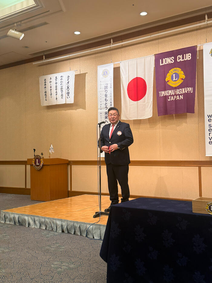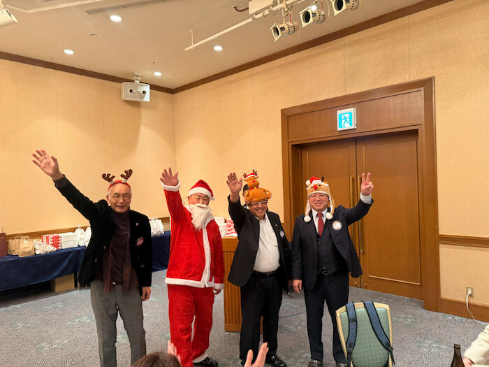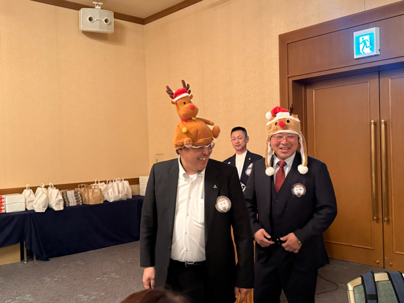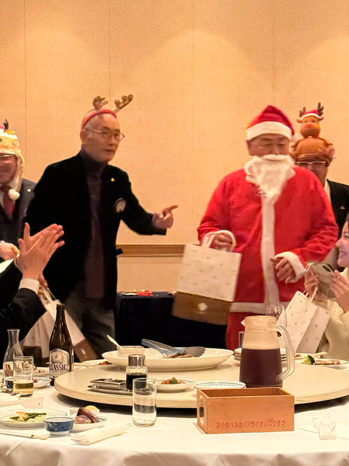 12月 11 12月第2例会クリスマス例会開催 2025年12月17日(水) ミーティング 苫小牧ハスカップライオンズクラブ NEW サンタとトナカイ(三役・第1副会長) 12月11日(木)は2025年度クリスマス例会を開催した。 家族と子供達が大勢集まり、本年度最後の例会を楽しみました。 計画委員長(副幹事) 会長挨拶 プレゼントを配る会長サンタ 大当たりで久保田GETのⅬ岡部喜代司 仲良し 幹事Ⅼ矢場 浩司と第一副会長Ⅼ小嶋 勝也