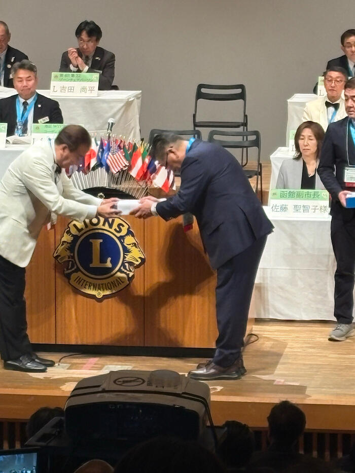 4月 25 第72回地区年次大会参加とアワード受賞 2026年04月25日(土) ミーティング 苫小牧ハスカップライオンズクラブ NEW 大会参加メンバー7名 331一C地区第72回地区年次大会に 当クラブからは、7名参加しました。 全員代議員会は出席です!! 式典では、アクティビティ優秀賞、会報優秀賞アワードをガバナーより表彰されました。