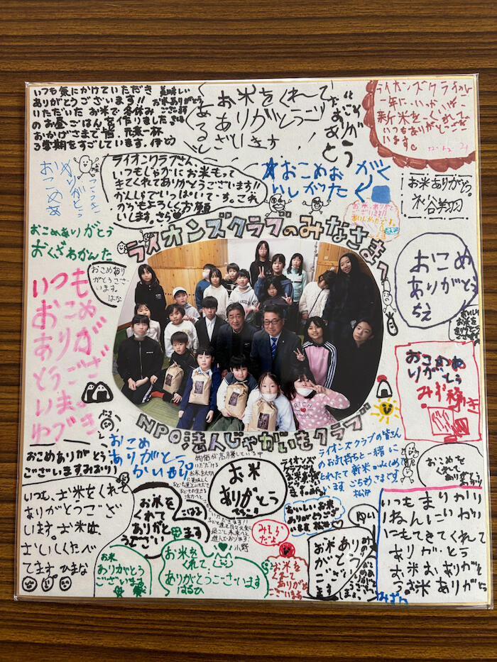 3月 05 じゃがいもクラブよりお米のお礼 2026年03月06日(金) アクティビティ 苫小牧ライオンズクラブ NEW 12月にNPO法人児童クラブのじゃがいもクラブへ田んぼのオーナー米の寄付した際のお礼の色紙が届きました。 子供たちからのかわいらしい字で思い思いにメッセージが書かれてあり、 毎年メンバーも心待ちにしており励みにもなってます。 冬休みの間は、マーボー丼、カレー、チャーハンなど作って食べたそうです。