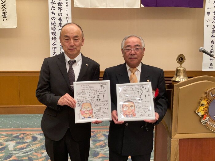10月 22 Lへ寄書を届けました。 2021年10月22日(金) ミーティング 苫小牧ライオンズクラブ ECHO Vol.4 2021年10月22日、三役にてかねてより計画しておりました、CMでもある終身会員のL竹本 清市と同じく終身会員のL成田 繁にクラブ会員より、似顔絵付きの寄書にメッセージを書いて頂いて、幹事がお届けしました。