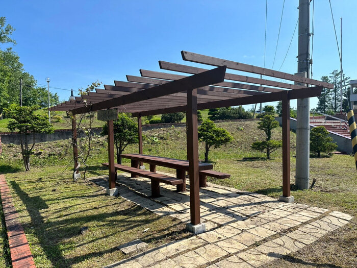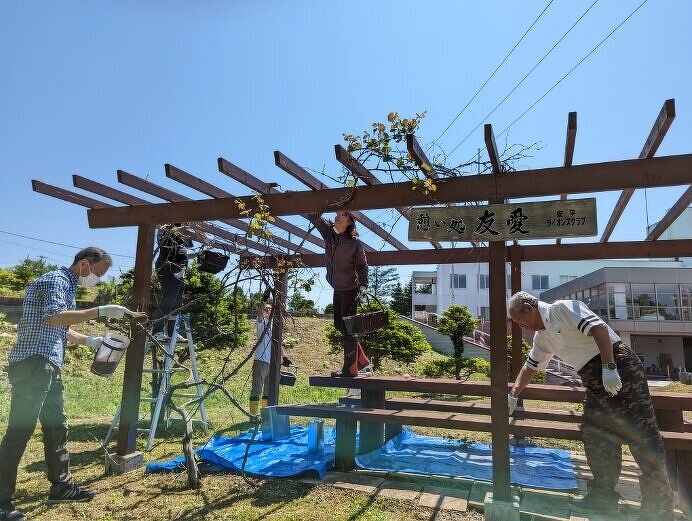 早来町民センター入口・藤棚(お休み処)のペンキの塗り替え作業を実施しました。