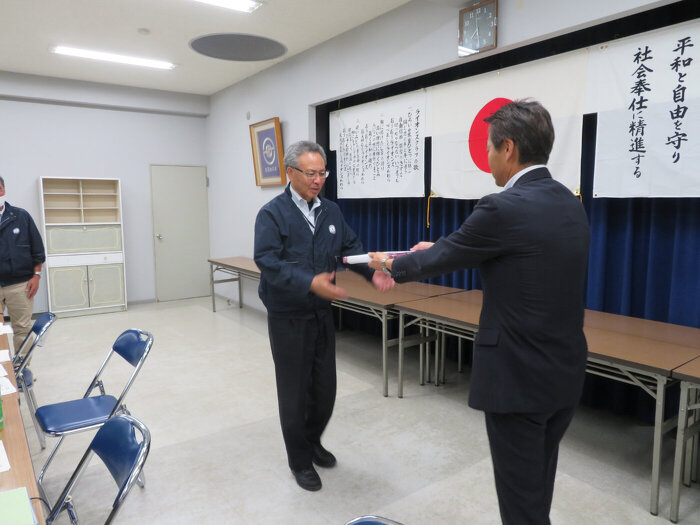 7月 02 今期初例会/7月第一例会 2024年07月26日(金) ミーティング 厚真ライオンズクラブ 前三役への記念品贈呈。お疲れ様でした! 7月2日(火)今期初例会を開催いたしました。 厚真LC認証50周年となる今期のスローガン『悠久の歩み、つなぐ奉仕の絆』が会長より発表されました。 諸先輩がたの歩みの歴史をしっかりと受け継ぎ、さらに奉仕の精神と会員相互の輪を大切にしながら未来につなげていけるようにと思いを込めて今年一年間の活動方針といたしました。 気持ちを新たに会員一丸となって、一念発起する初例会となりました。